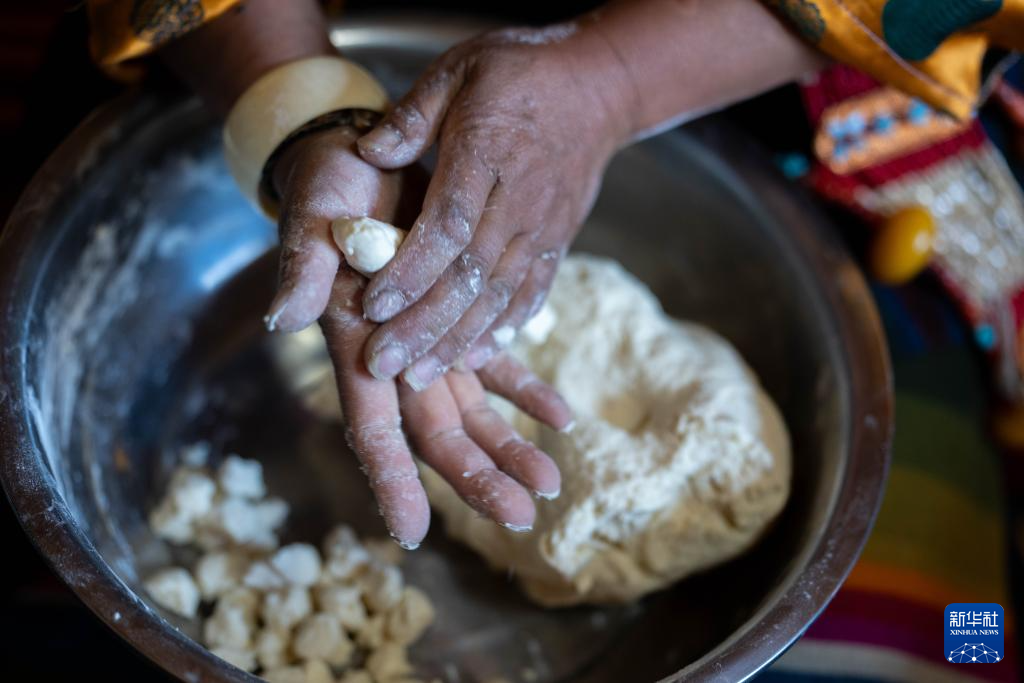 2月16日,長所鄉古榮村村民卓瑪次仁在制作年節食品“古突”。在藏語中,“古”意為“九”,“突”意為“面”,“古突”是一種用牦牛肉湯加入牛肉、蘿卜、奶渣等食材熬煮的面食。按西藏傳統習俗,“古突”夜,家家戶戶迎來團聚,一起享用“古突”。新華社記者 旦增尼瑪曲珠 攝