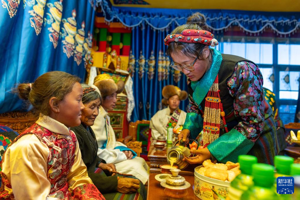 2月16日,長所鄉古榮村村民桑杰的大女兒旦增旺姆(右一)給奶奶次仁塔決倒茶。新華社記者 旦增尼瑪曲珠 攝