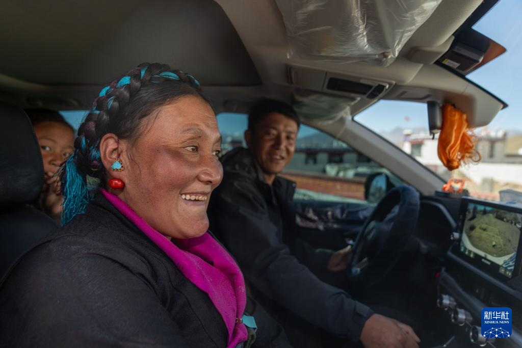 2月16日,長所鄉古榮村村民桑杰(右)帶著愛人卓瑪次仁和小女兒旦增格央去買年貨。新華社記者 旦增尼瑪曲珠 攝