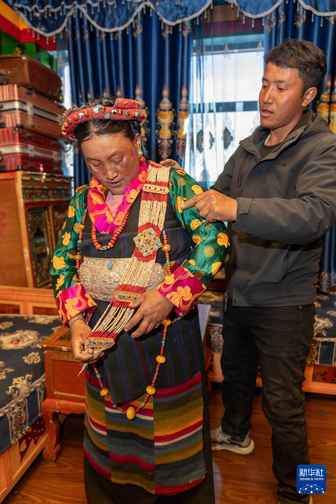 2月16日,長所鄉古榮村村民桑杰(右)給愛人卓瑪次仁佩戴首飾。新華社記者 旦增尼瑪曲珠 攝