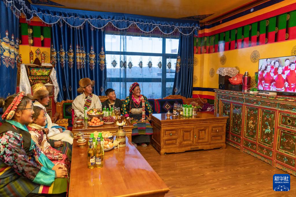 2月16日,長所鄉古榮村村民桑杰一家在新居里觀看春晚。新華社記者 旦增尼瑪曲珠 攝