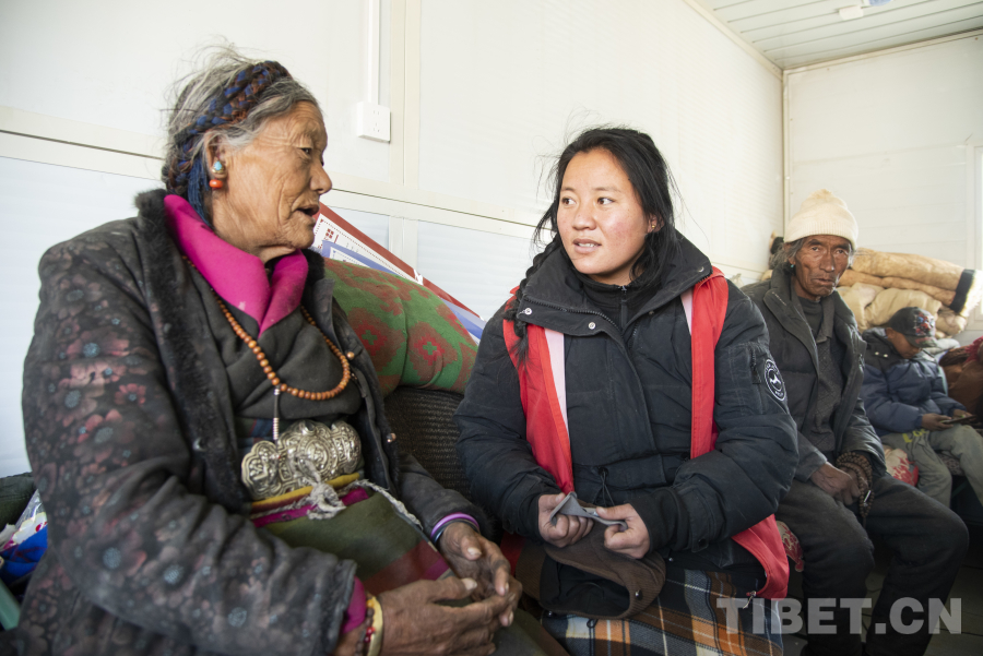圖為次仁玉珍(左二)正在安置點內(nèi)了解受災(zāi)群眾情況 攝影:趙振宇