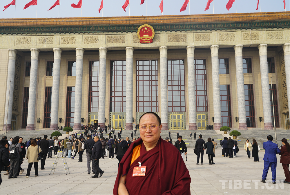 圖為全國政協委員達扎·尕讓托布旦拉西降措在人民大會堂前 攝影:楊眉笑