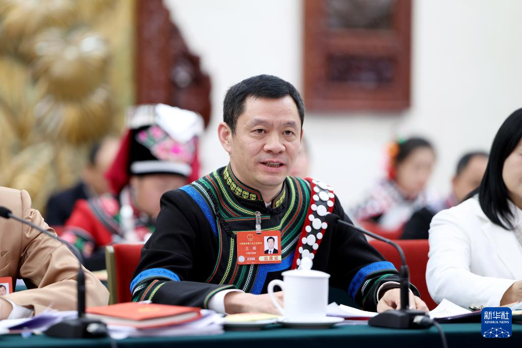 3月5日,全國人大代表王剛在云南代表團全體會議上發言。當日下午,十四屆全國人大三次會議各代表團舉行全體會議,審議政府工作報告。新華社記者 劉彬 攝