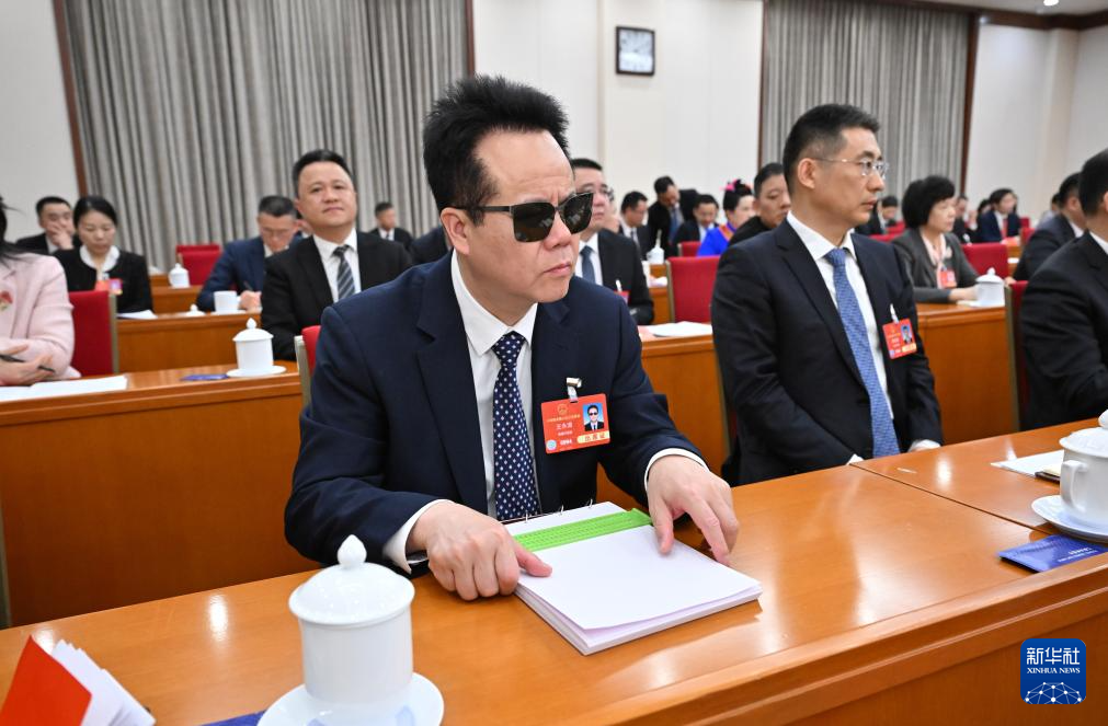 3月5日,代表們在貴州代表團全體會議上認真聽會。當日下午,十四屆全國人大三次會議各代表團舉行全體會議,審議政府工作報告。新華社記者 翟健嵐 攝