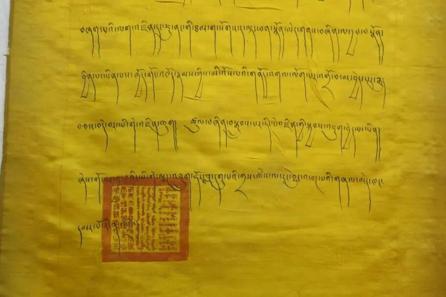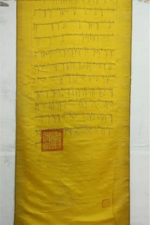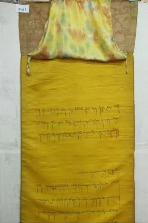 西藏博物館收藏著一份六世達賴喇嘛發布的文告(圖一)。這份發布于1700年(藏歷鐵龍年)的文件,書寫于黃色絲綢上,裝裱華麗如唐卡。